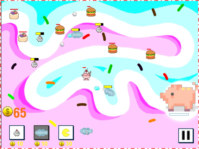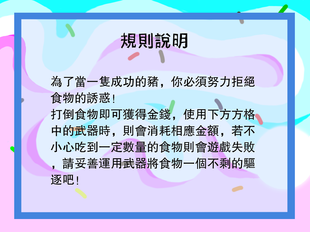 ✓ 一定時間內不失敗即通關,豬被餵飽了即失敗。